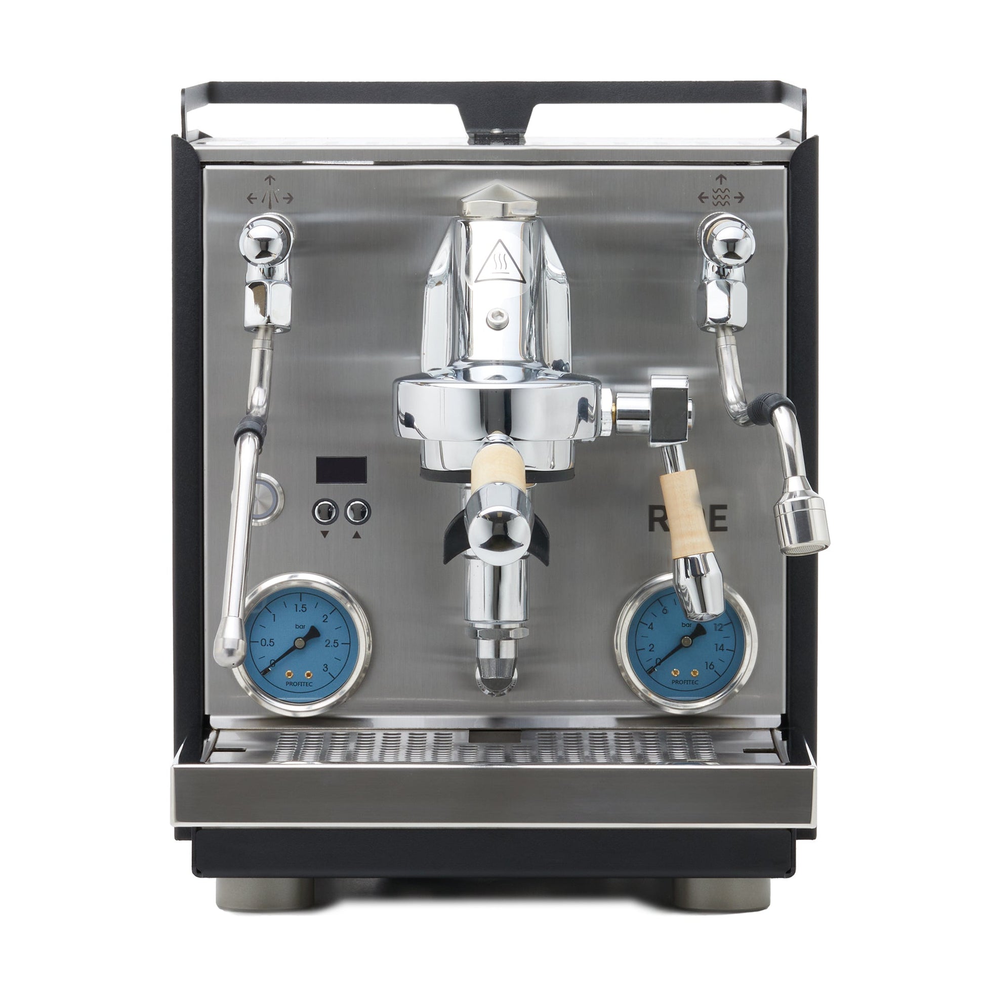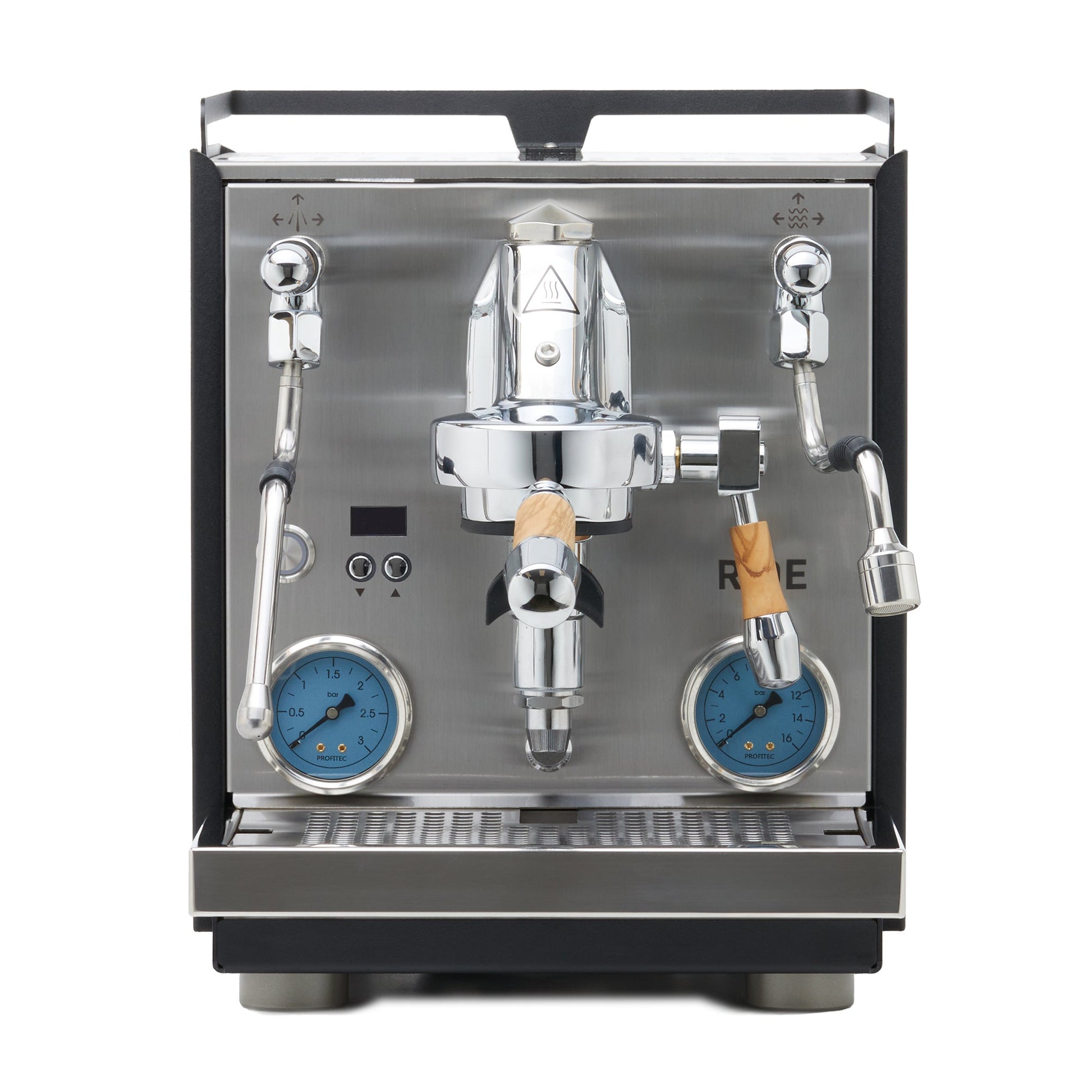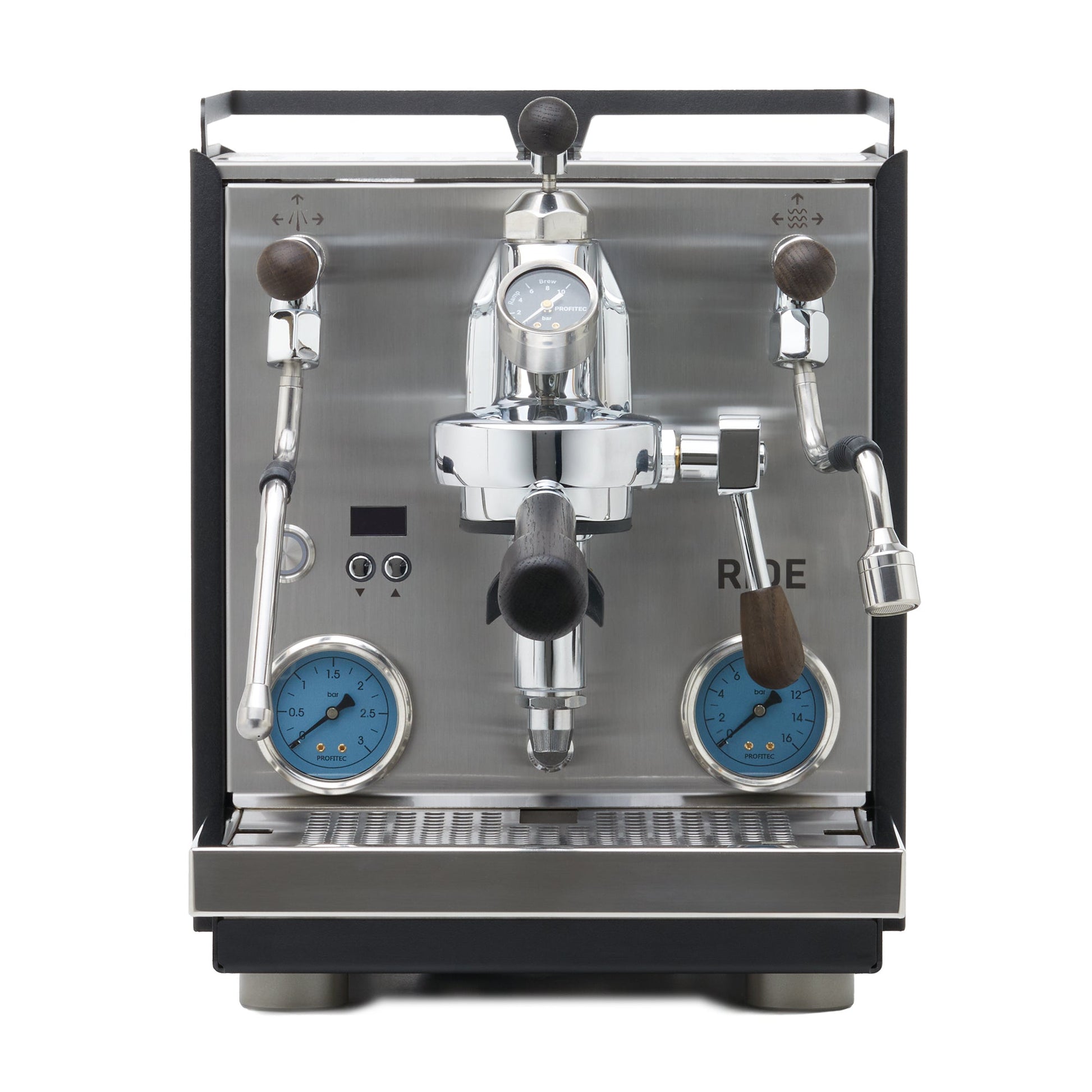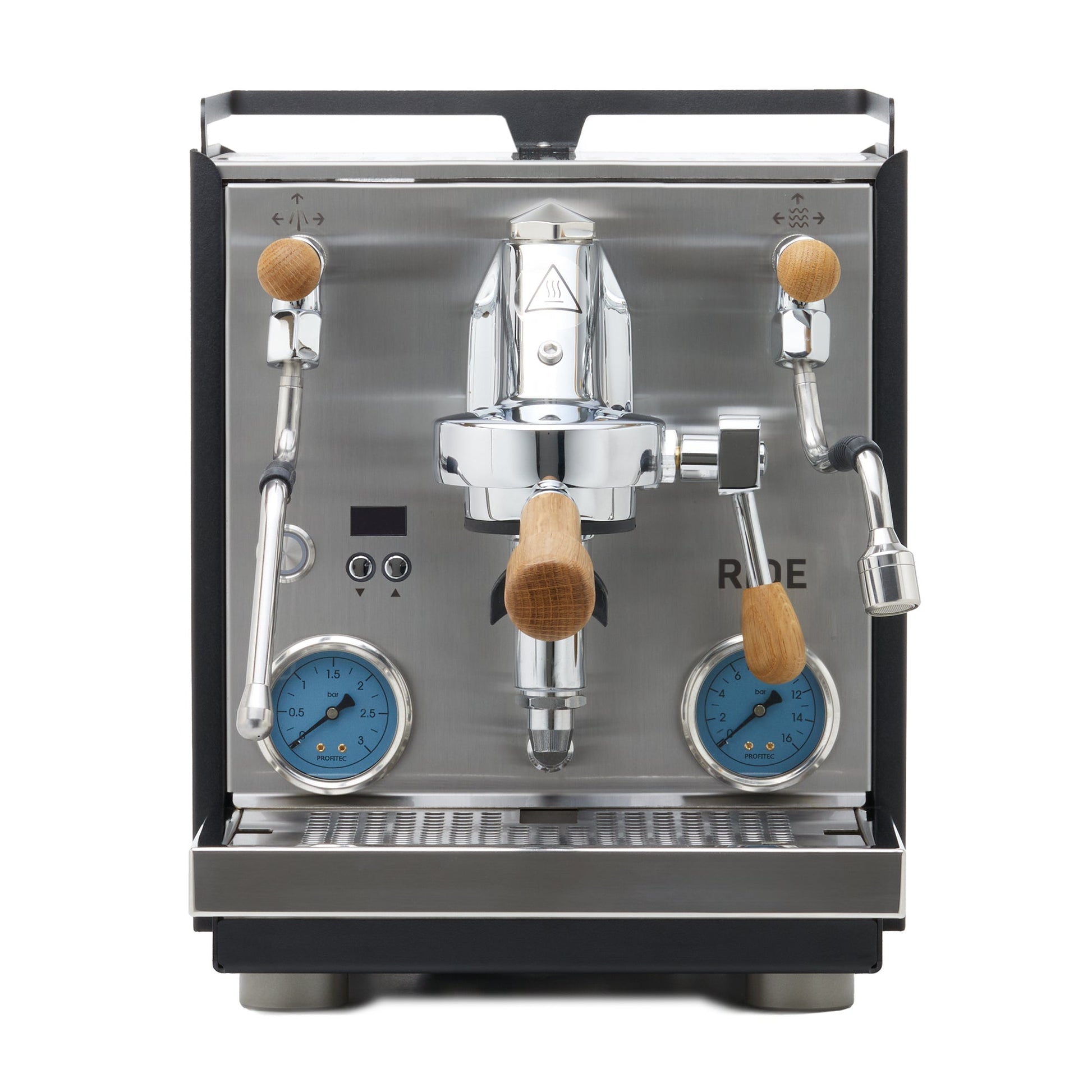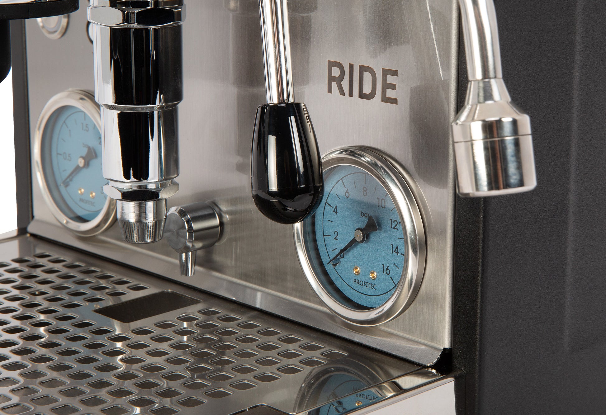 PID temperature regulation pinpoints boiler temperatures much more precisely, while the dual boiler design ensures that each boiler is monitored and heated independently ensuring greater stability. The RIDE features a 2.8 L reservoir, 0.75 L stainless steel brew boiler, and 1 L stainless steel steam boiler, as well as two uniquely blue gauges that read out brew and boiler pressure.